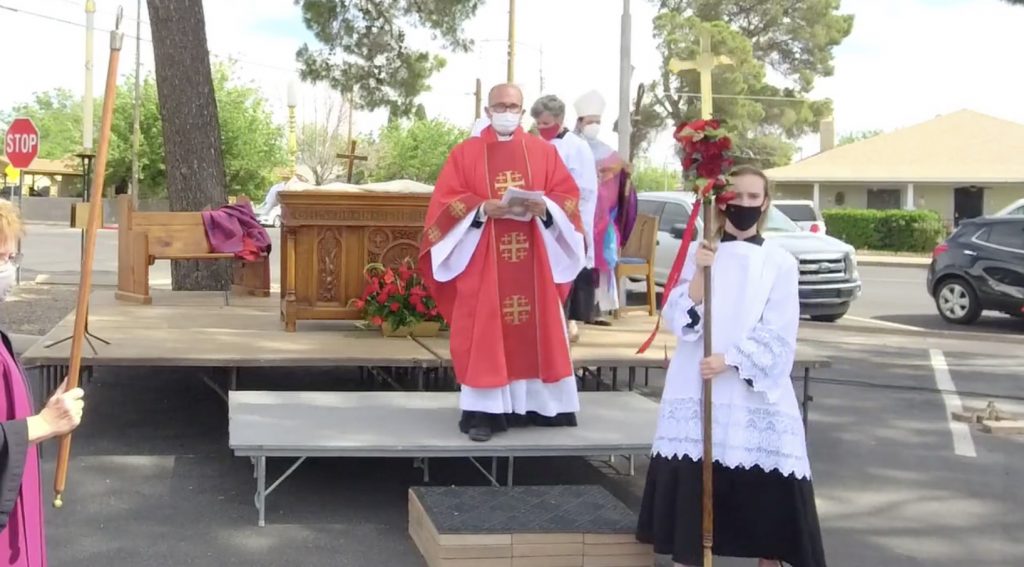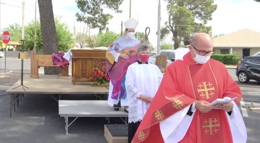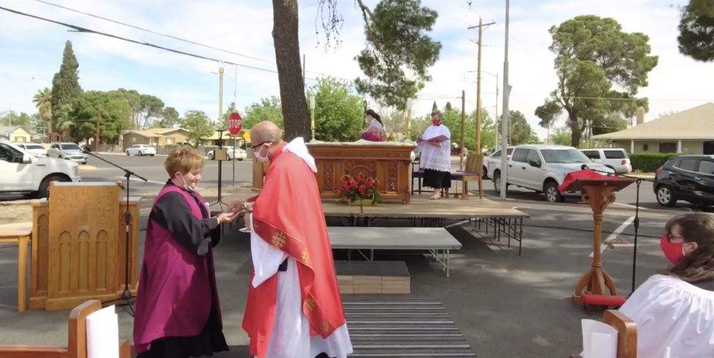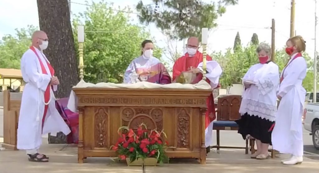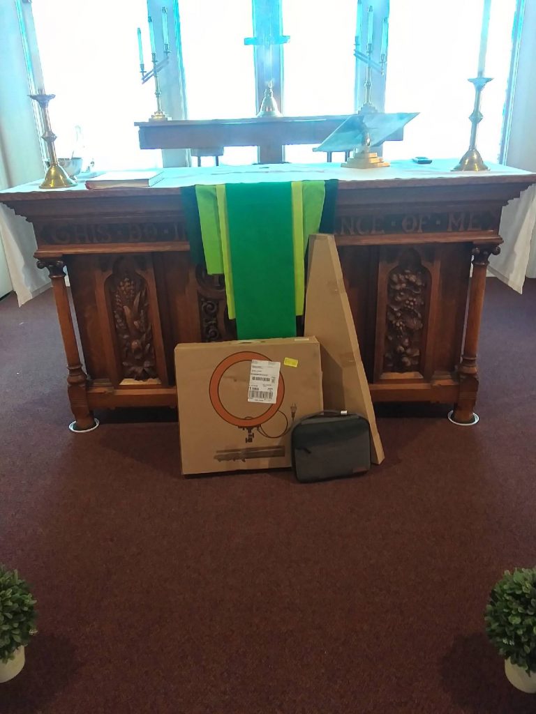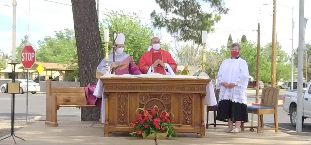 The old and the new in one picture….new video equipment in front of the “oldest non-Catholic altar in the entire state of Arizona. The altar was hand made in Tucson by a Hispanic gentleman named Felix. It was consecrated in 1892 and has been in continuous use since that day. On Sunday, January 24 we pray over and bless the new video equipment we received from the UTO Grant as we join together the history of the Church to the future of the Church and the work of the Holy Spirit in the world. Kenneth Lee and Mindy Weisser-Lee are assisting in the blessing.