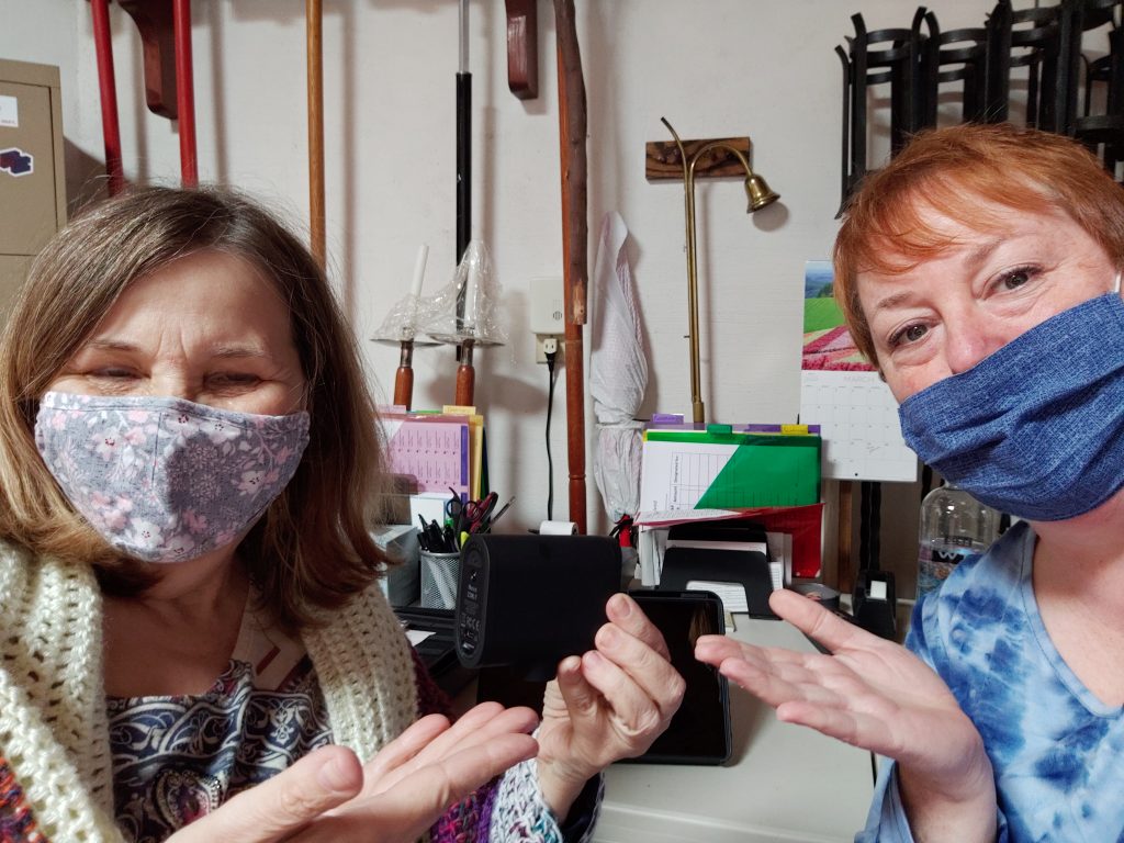 Kari Davis from St. Peter’s, Casa Grande showing Cindy how to use the new streaming equipment. More to come!